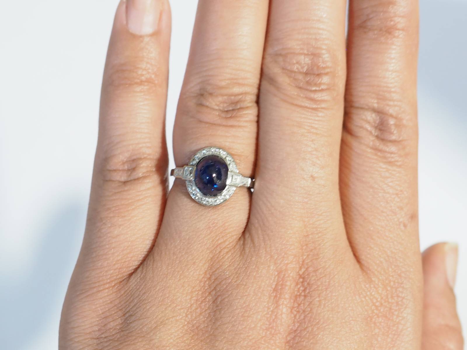 Dans notre bijouterie à Marseille, découvrez cette élégante bague en platine 950 millièmes, sertie d’un superbe saphir naturel cabochon et entourée de diamants taille brillant.