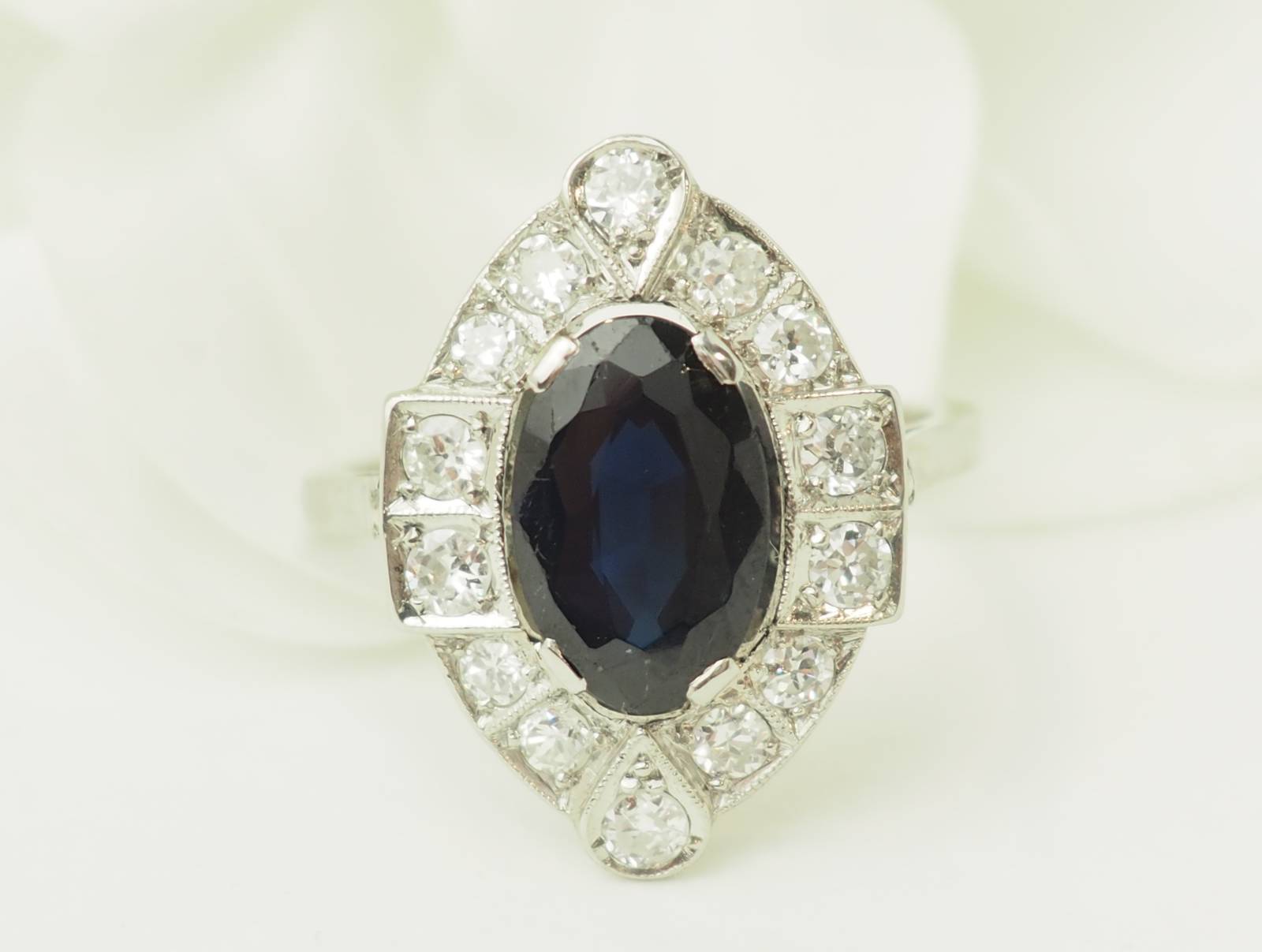 Élégante et raffinée, cette magnifique bague en platine illustre parfaitement l’esthétique intemporelle de la joaillerie de style Art Déco, très appréciée pour ses lignes harmonieuses et sa sophistication discrète. Au centre de la composition trône un superbe saphir ovale, d’un bleu profond et velouté, dont l’intensité de la couleur capte immédiatement le regard. Cette pierre précieuse est mise en valeur par un délicat entourage de diamants scintillants, soigneusement sertis dans une monture géométrique typique de l’esprit Art Déco.