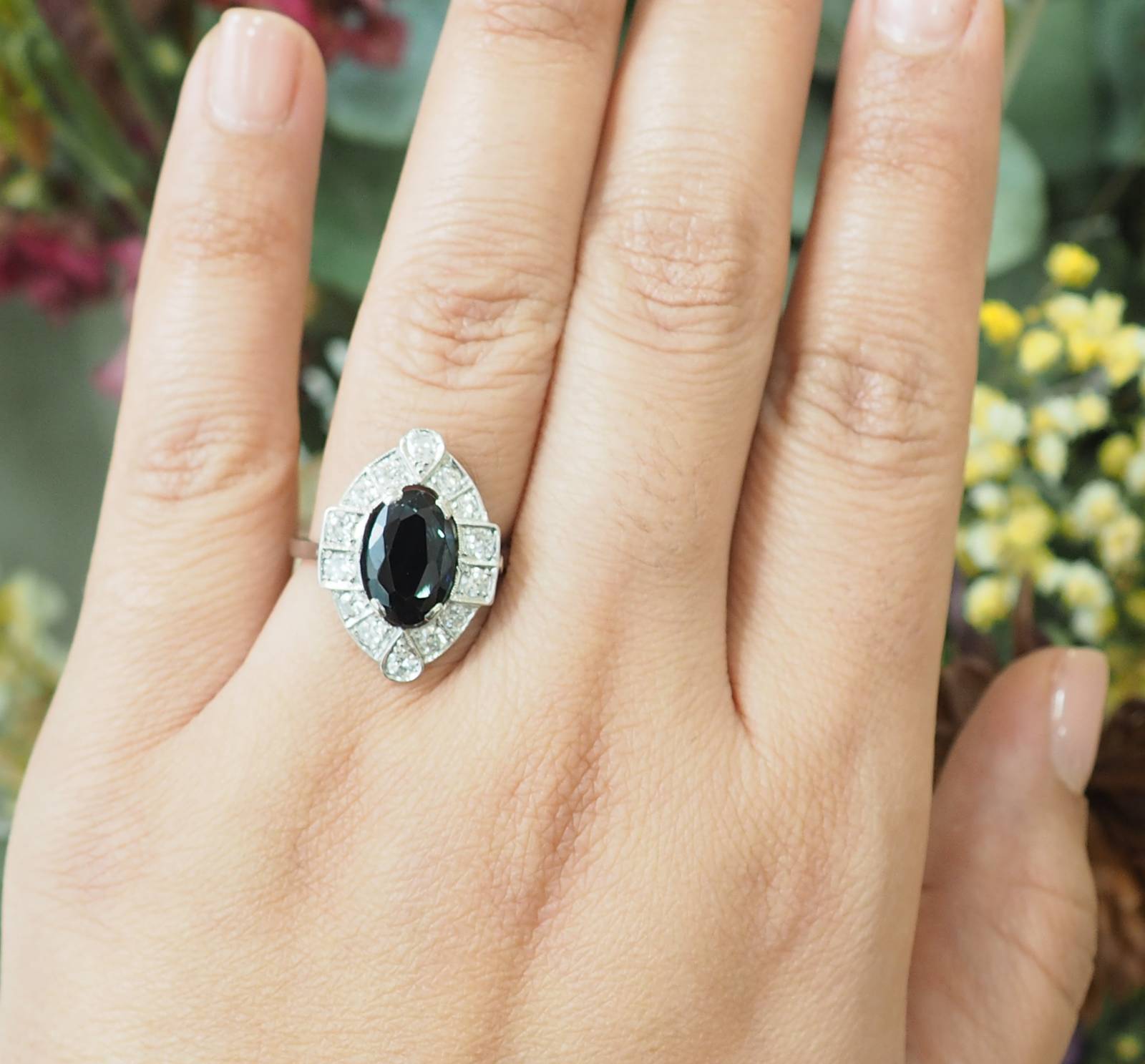 Les diamants, disposés avec équilibre autour de la pierre centrale, apportent éclat et luminosité à l’ensemble, créant un contraste élégant avec la profondeur du saphir. La monture en platine, métal noble et durable très prisé en joaillerie, souligne la finesse du travail et assure une excellente tenue des pierres dans le temps. Les lignes symétriques et le design structuré rappellent l’influence artistique des années 1920 à 1930, période emblématique de la haute joaillerie.