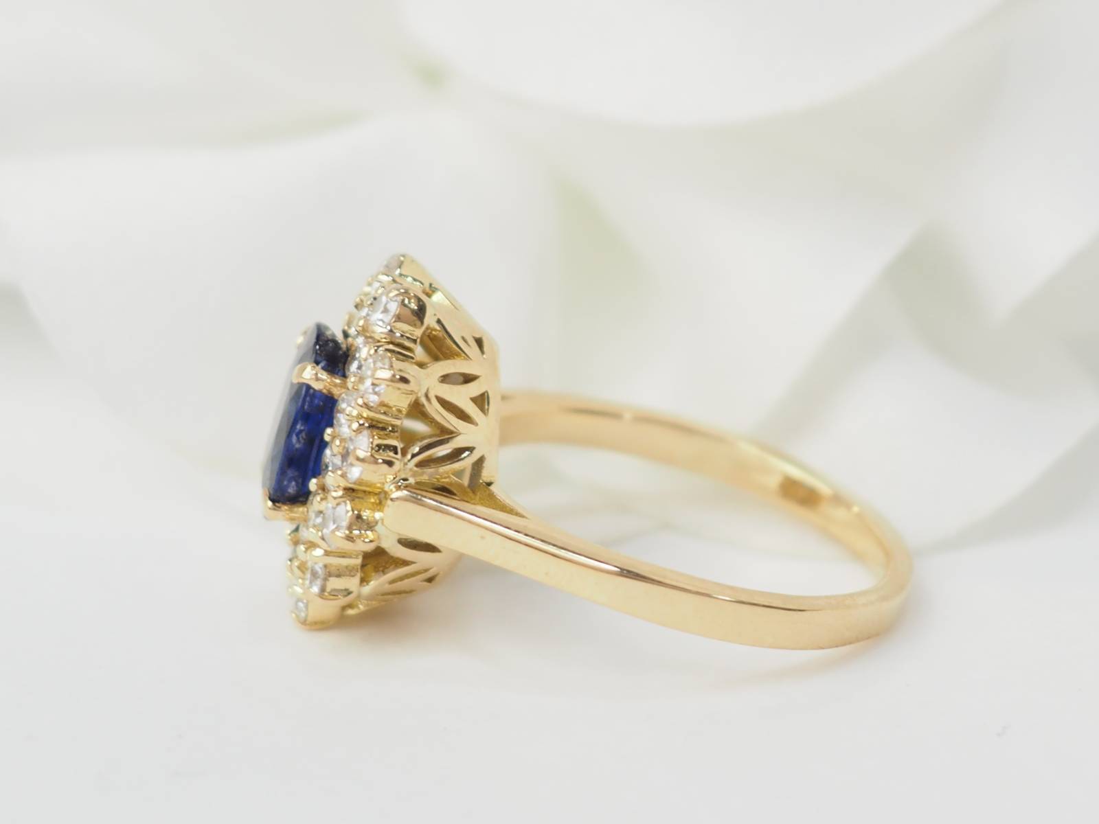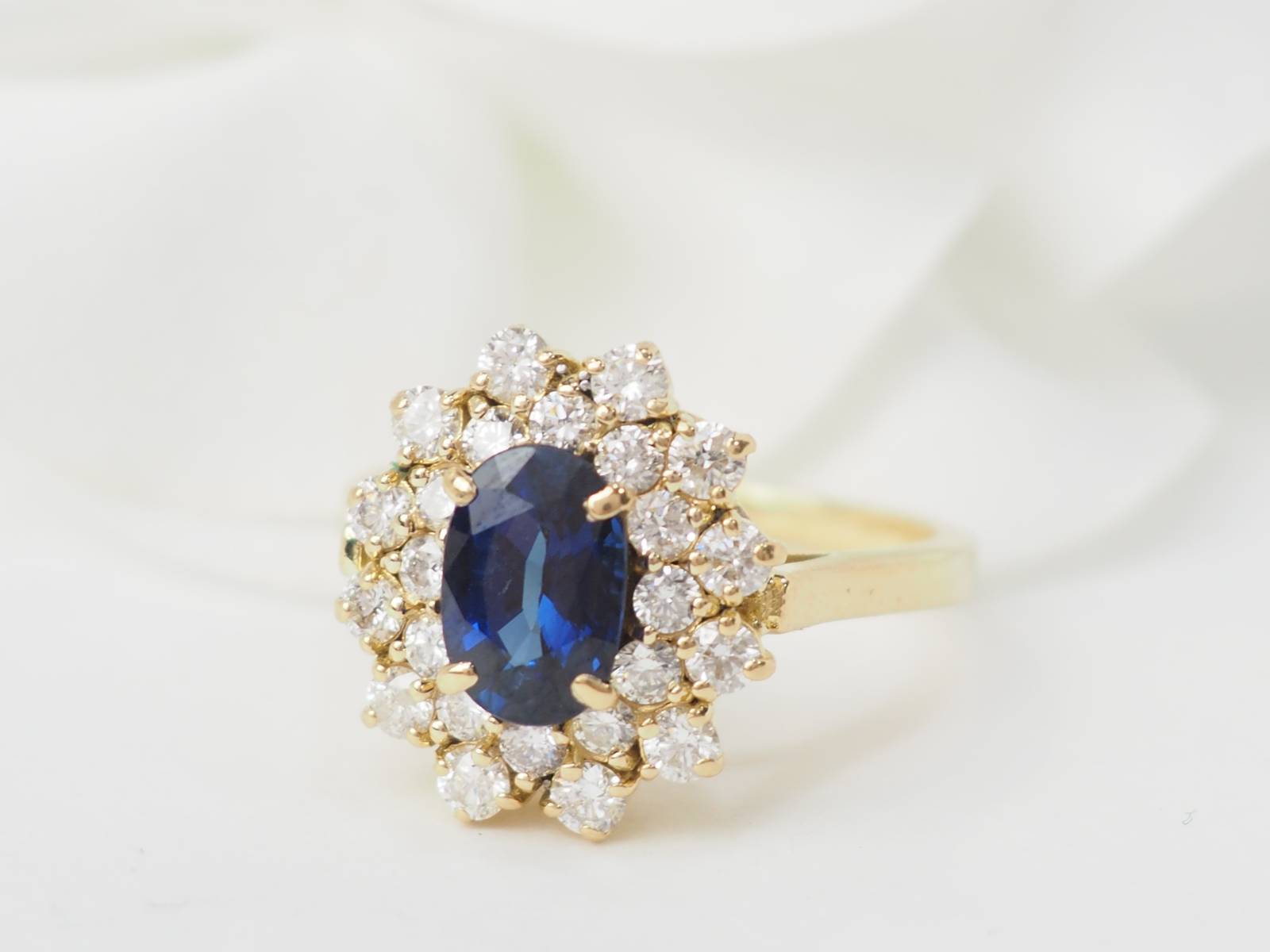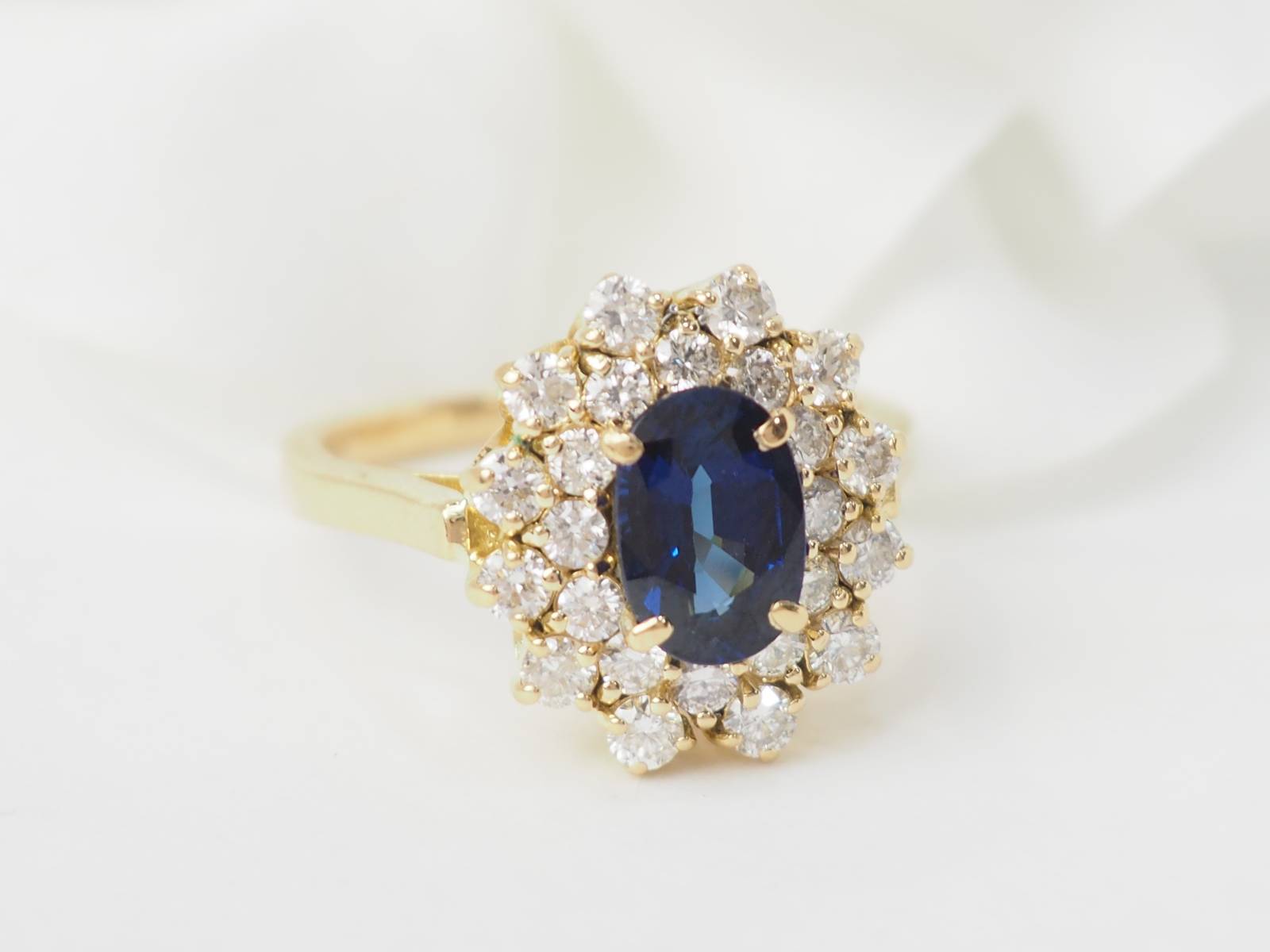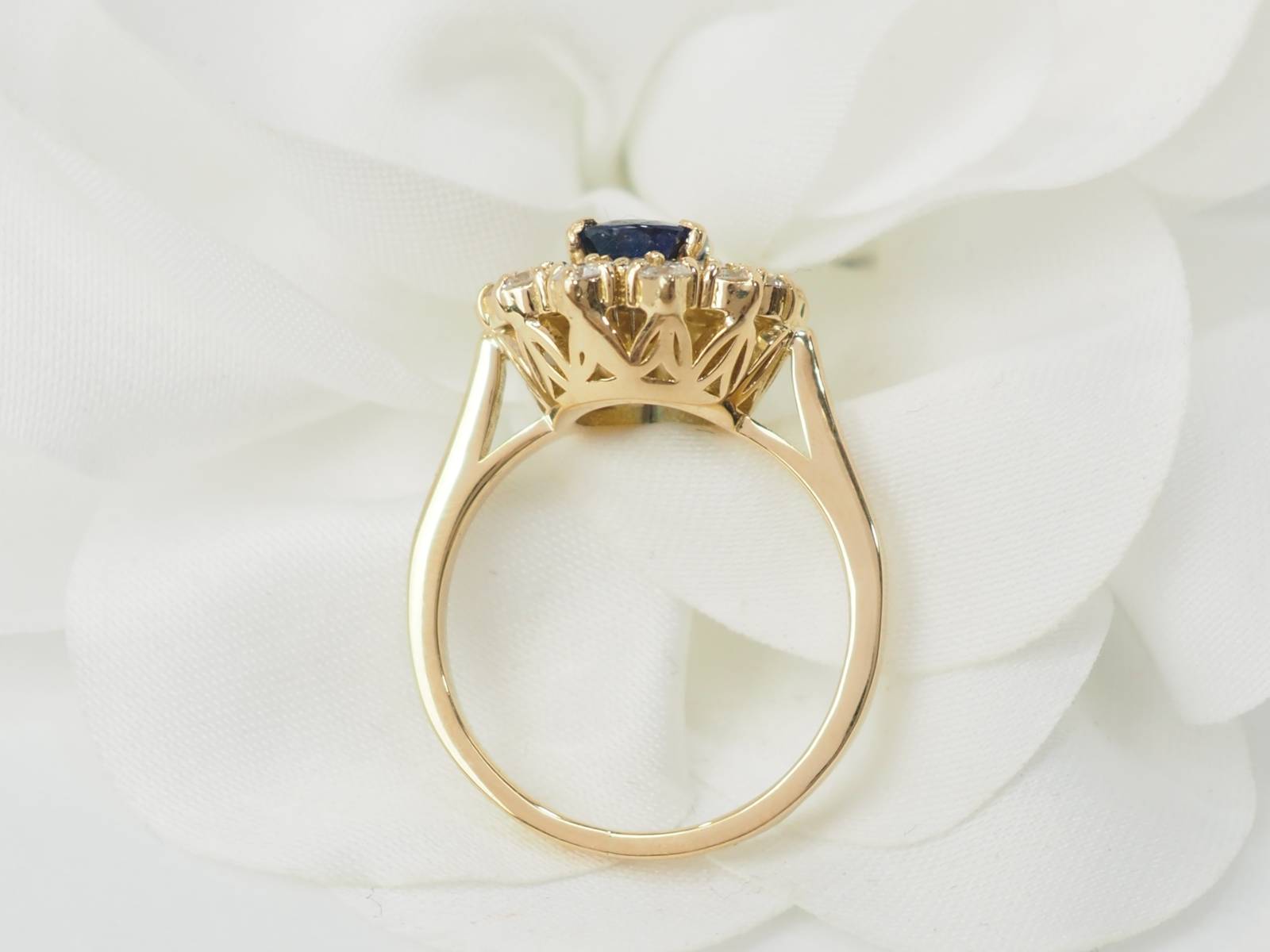 Cette bague entourage en or jaune, saphir et diamants est dans un excellent état est proposée à un prix de € dans notre bijouterie joaillerie située près d'Aix-en-Provence.