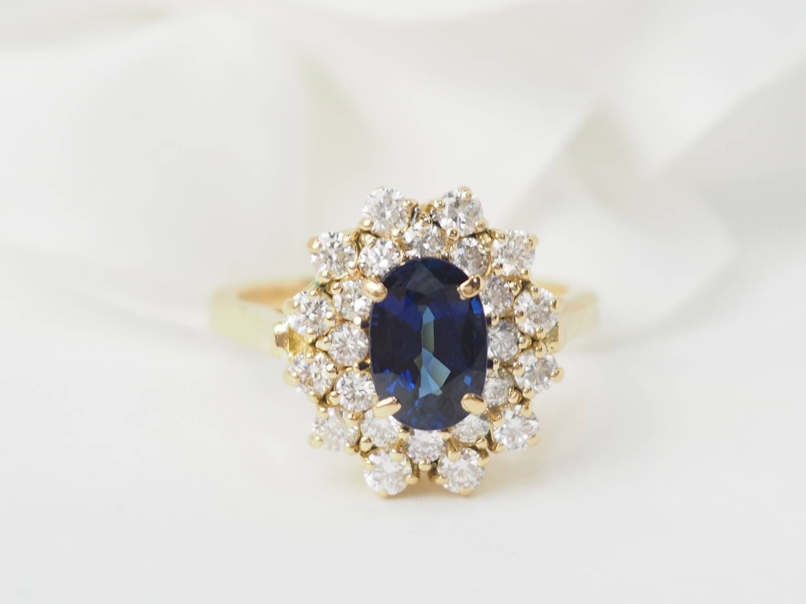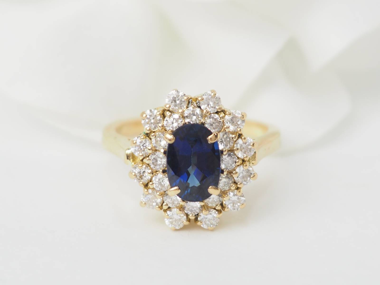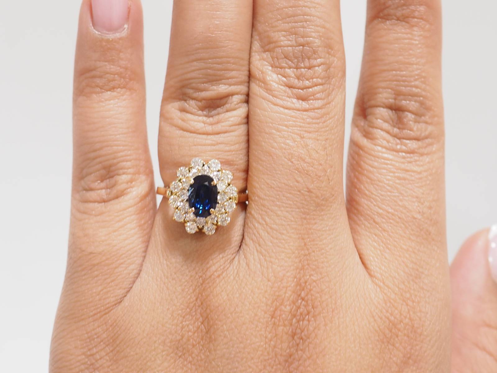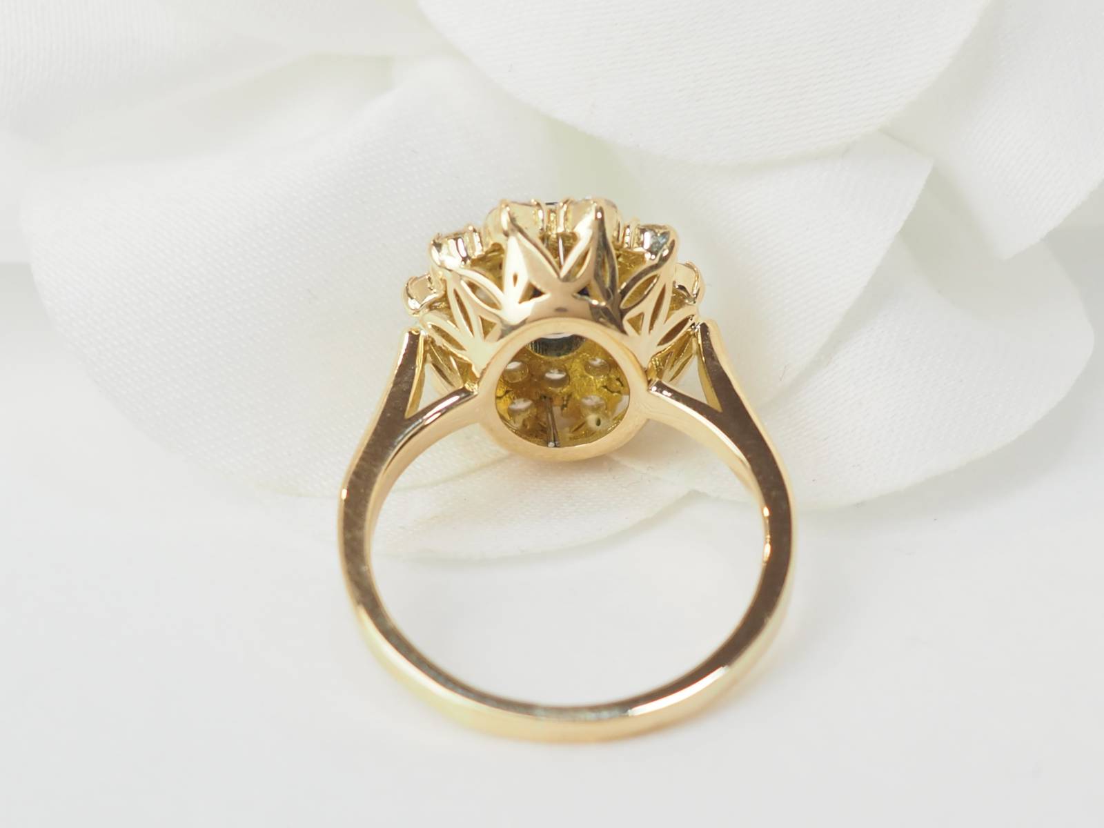 Cette bague entourage en or jaune, saphir et diamants est dans un excellent état est proposée à un prix de € dans notre bijouterie joaillerie située près d'Aix-en-Provence.