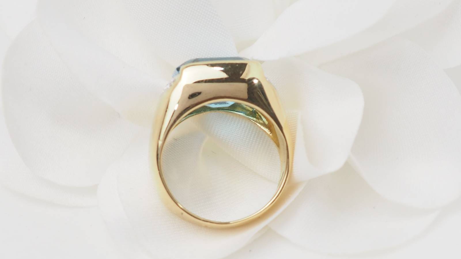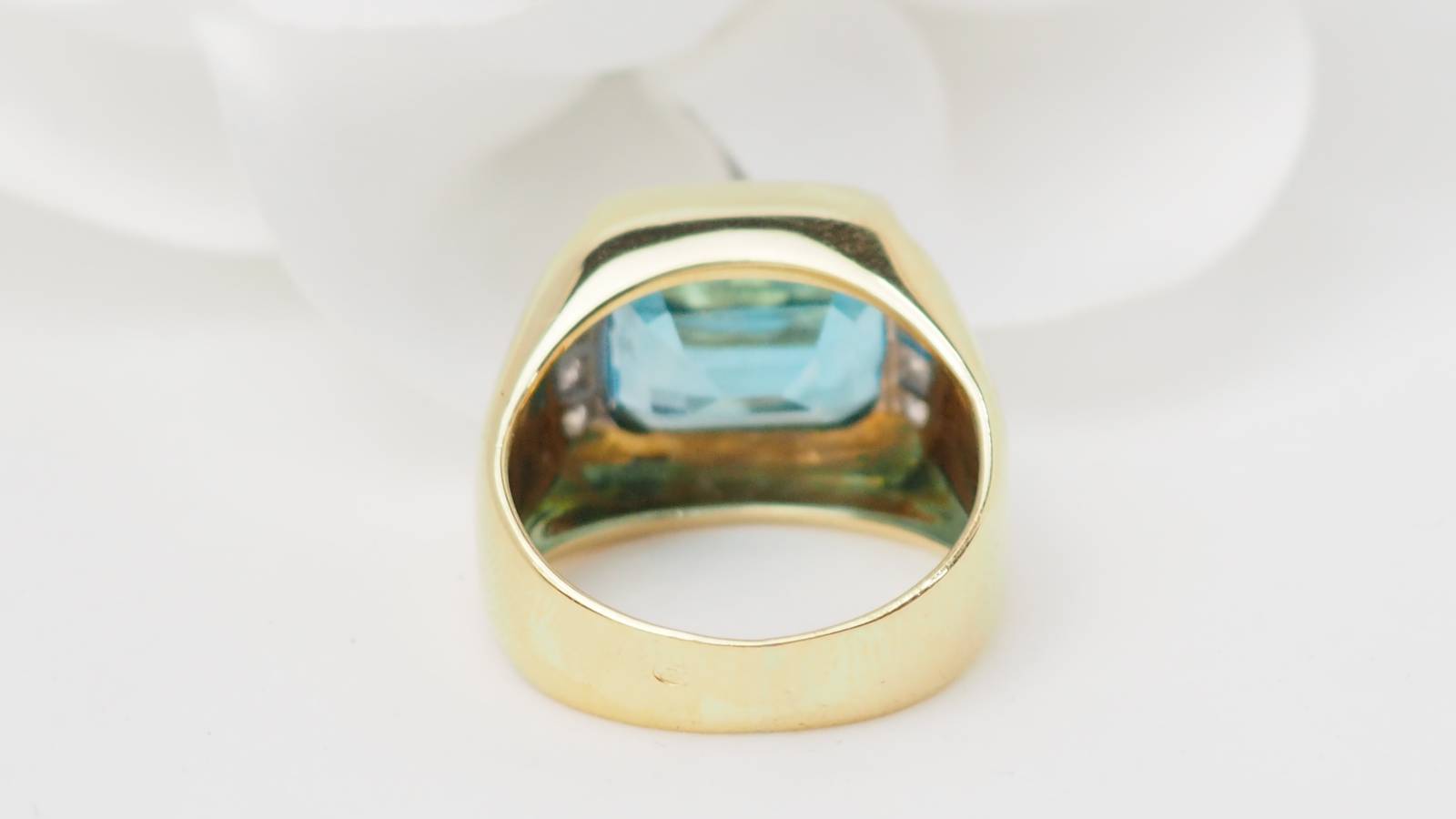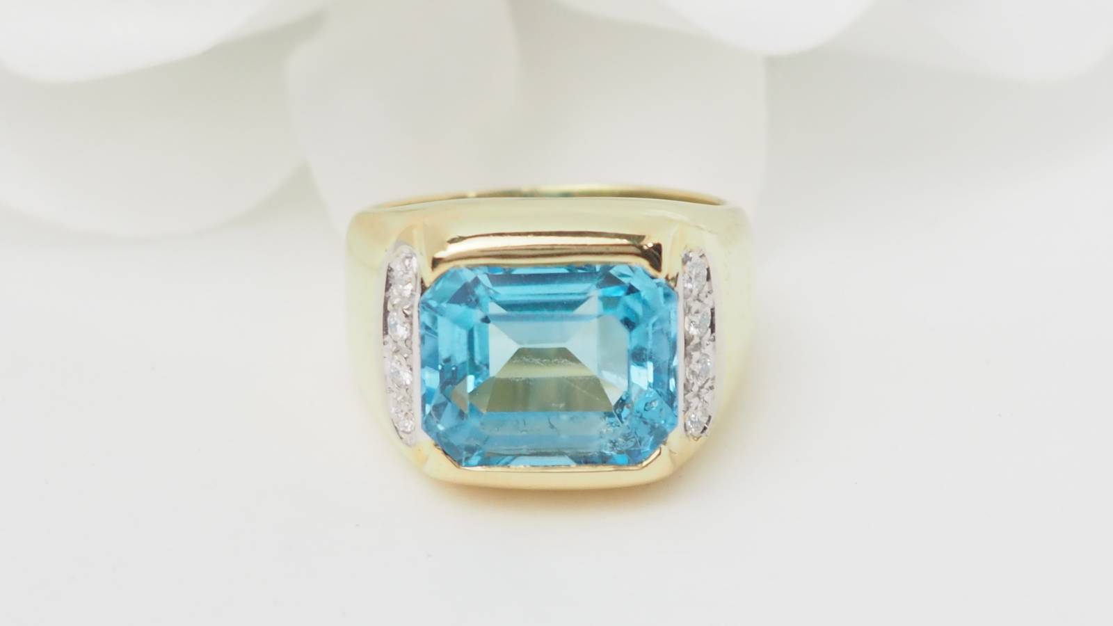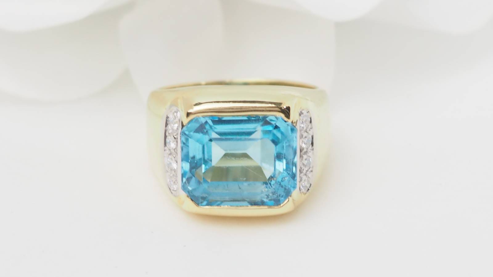Nous vous suggérons, par exemple, cette très jolie bague en or jaune, Topaze bleue et diamants.