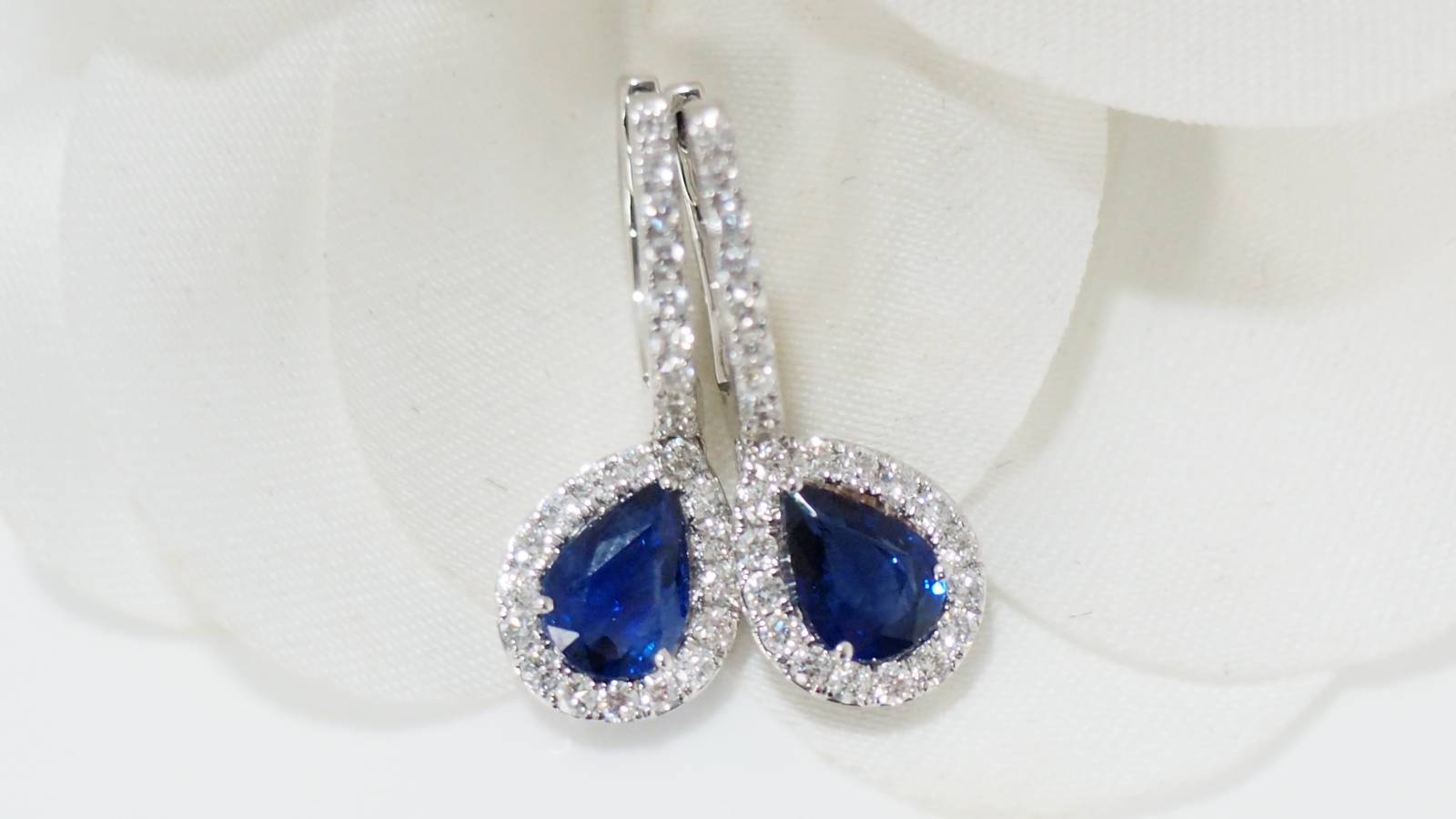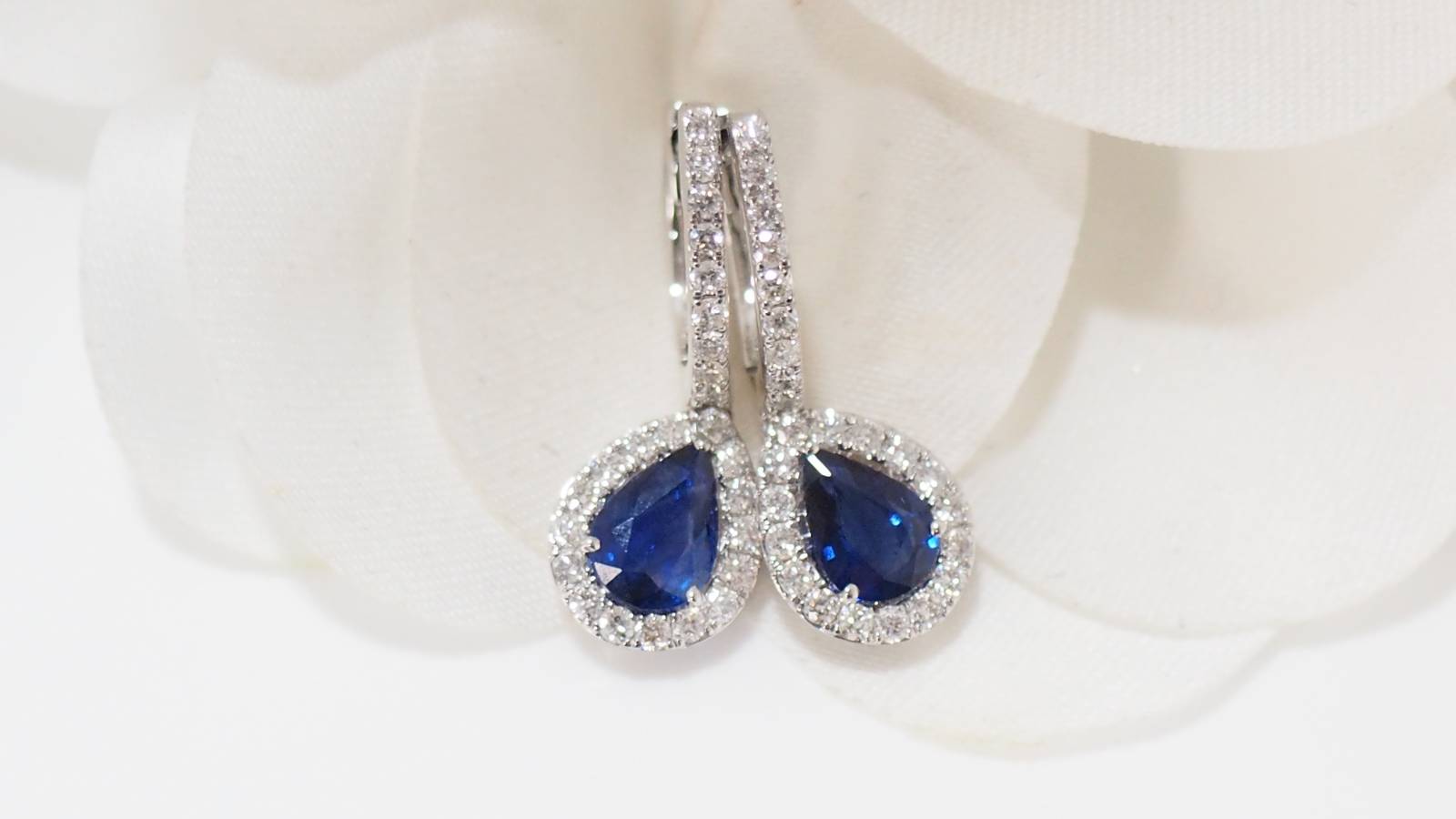 Dans notre bijouterie, vous trouverez, par exemple, cette jolie paire de boucles d'oreilles pendantes en or blanc saphir de Ceylan et diamants.