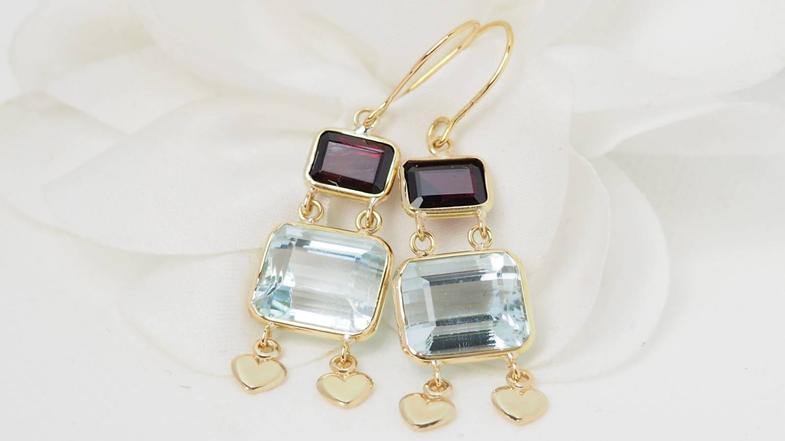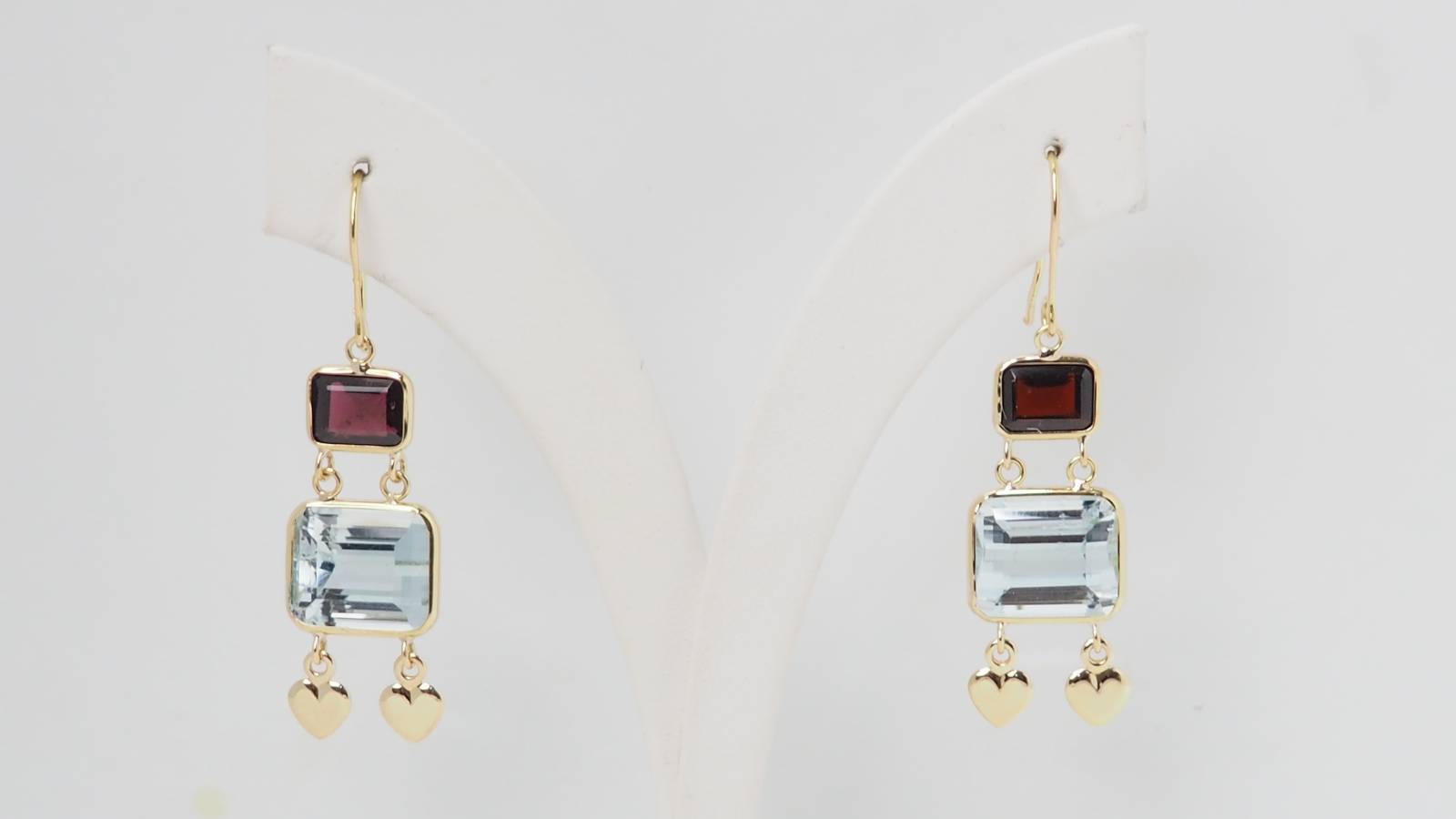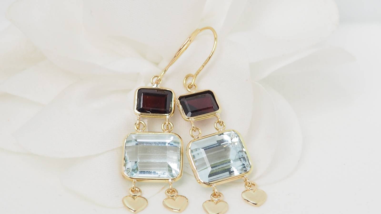 Boucles d'oreilles en or jaune, aigue marine et grenat