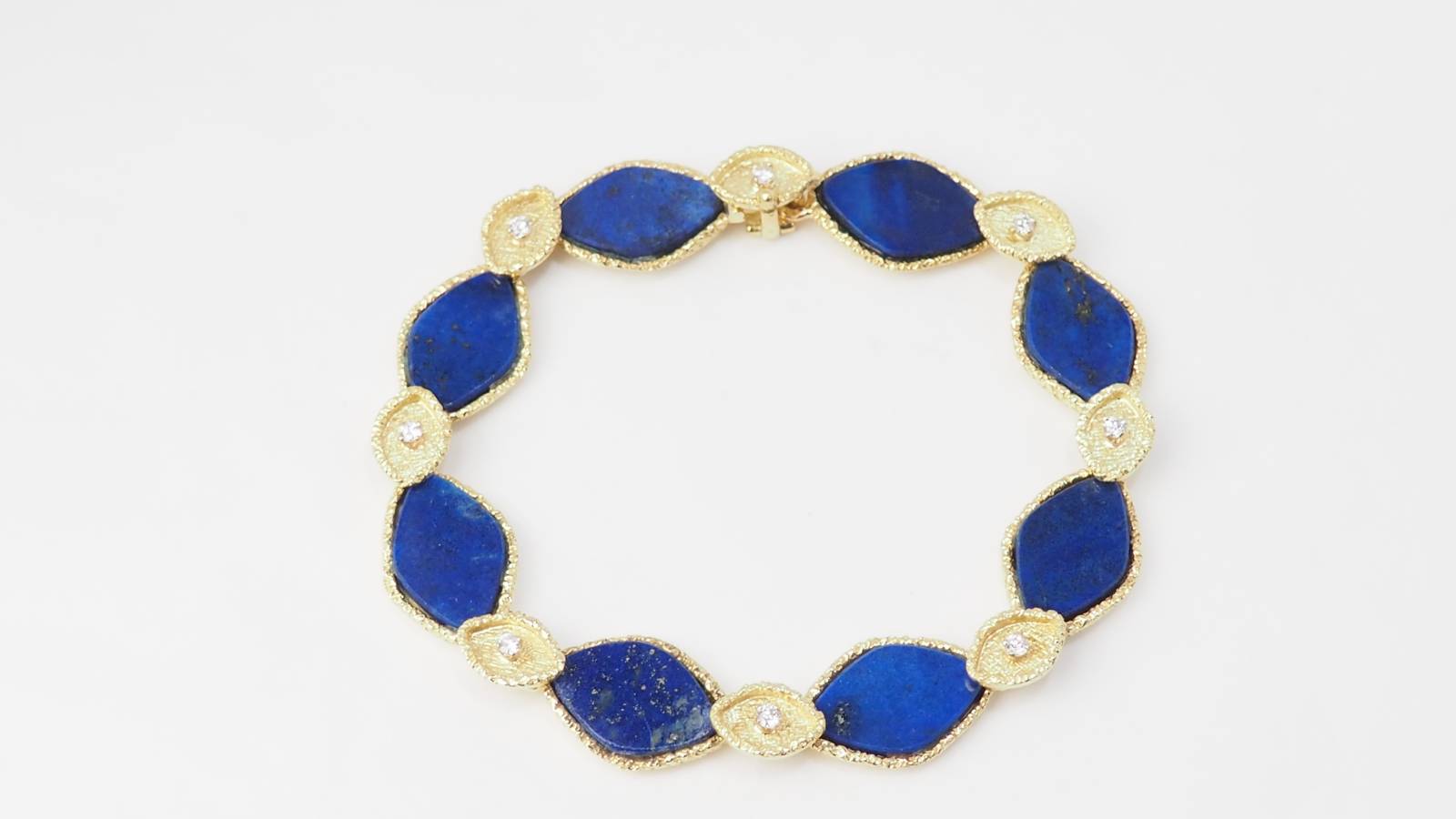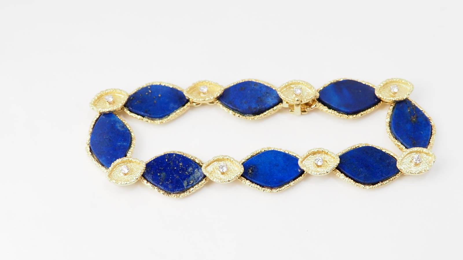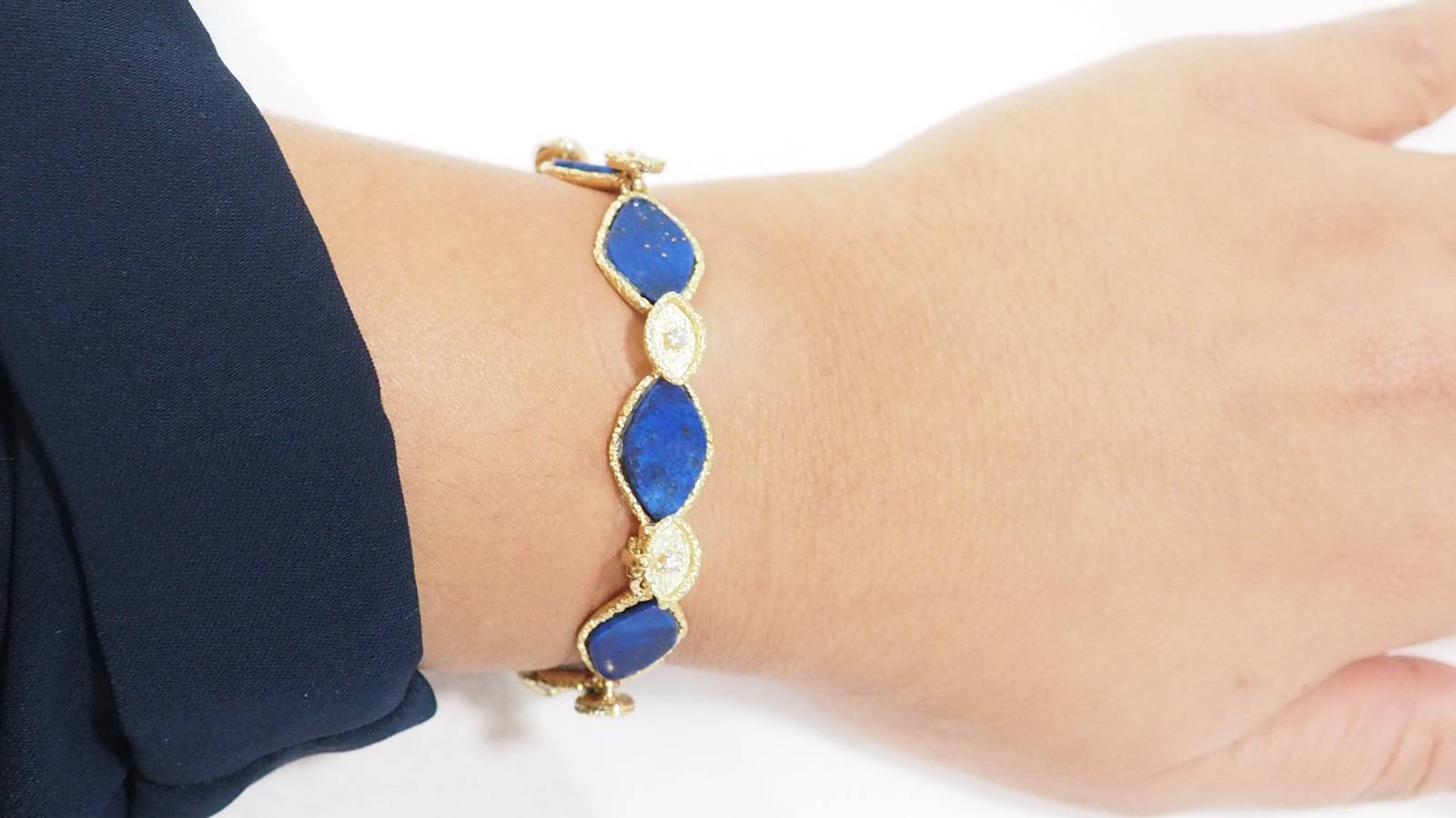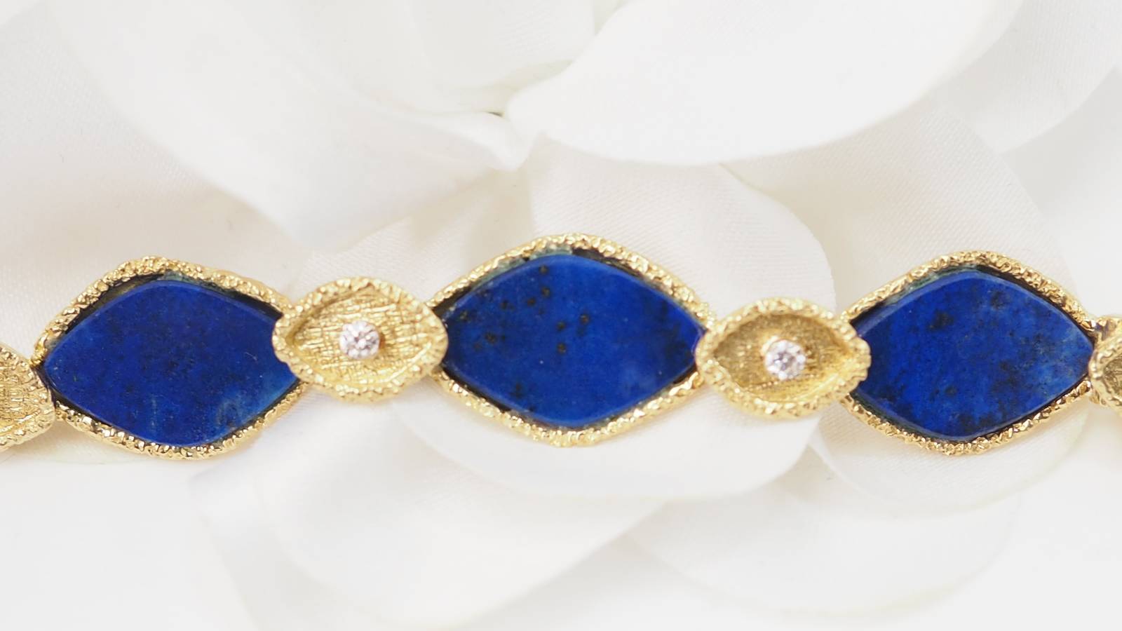 En vous rendant dans notre bijouterie, vous retrouverez, par exemple, ce magnifique bracelet en or jaune sertis de Lapis Lazuli et diamants.