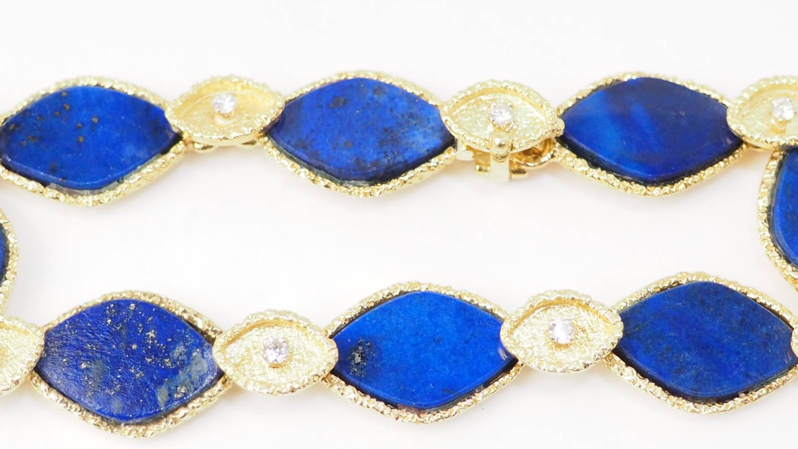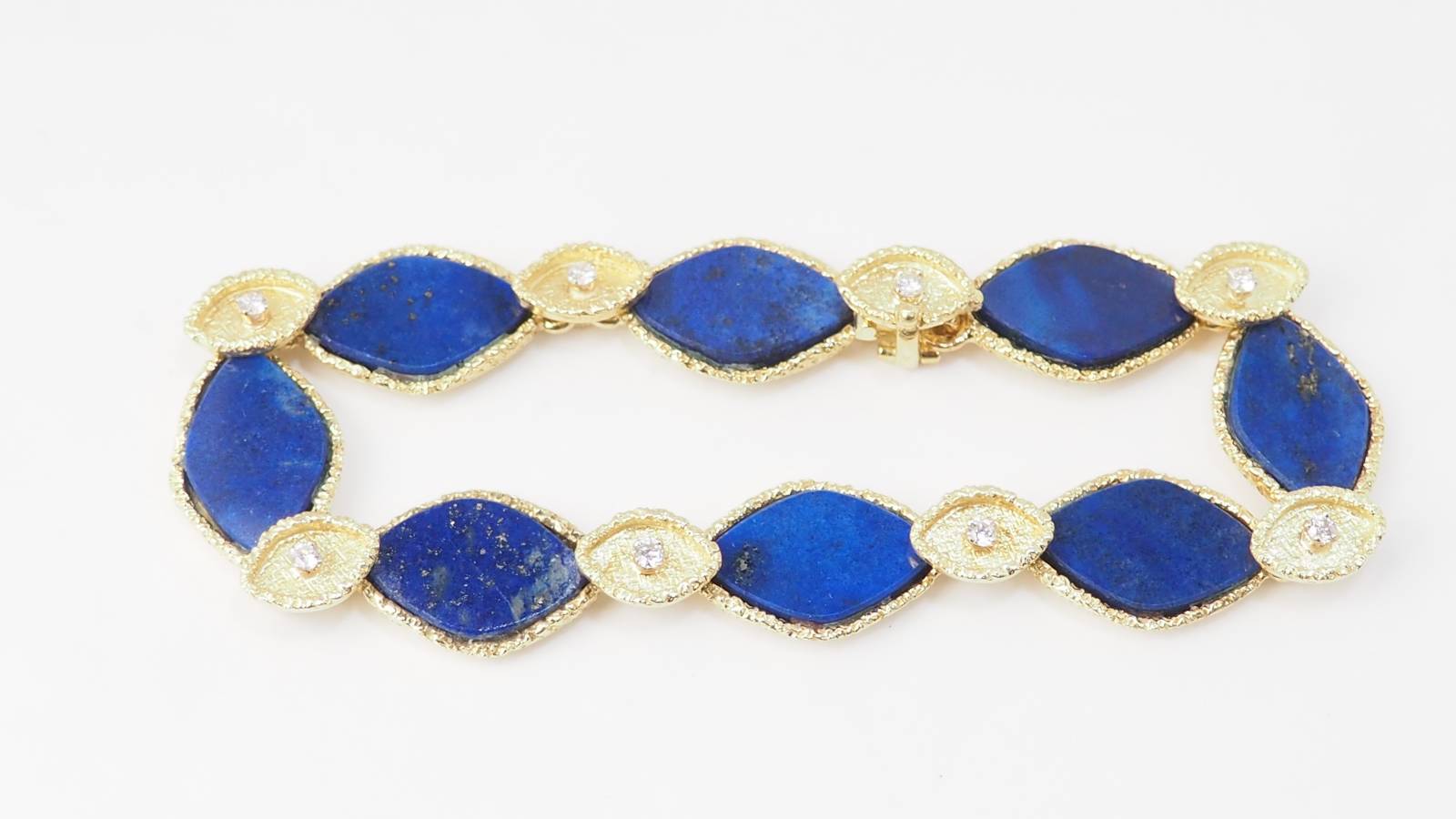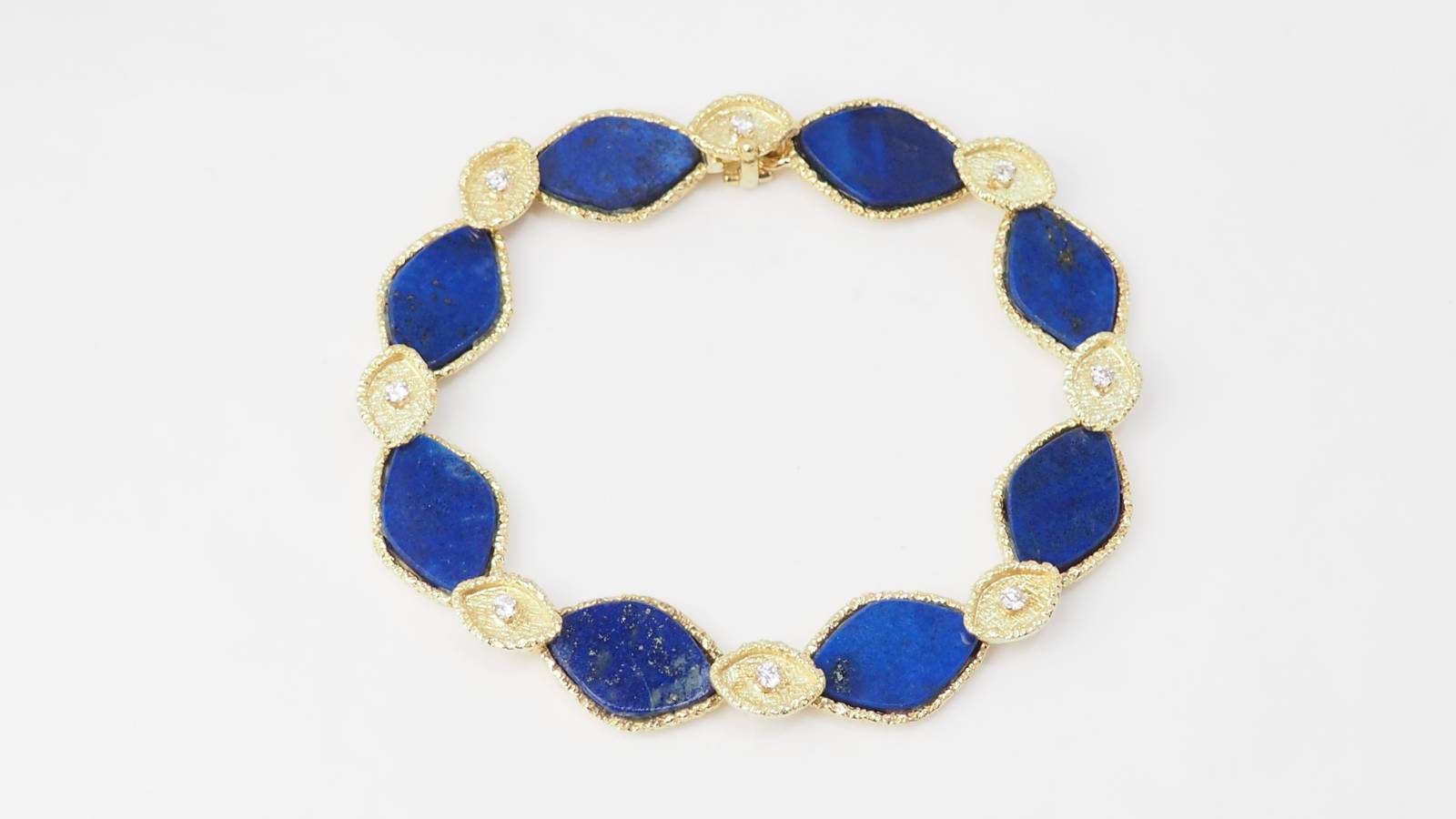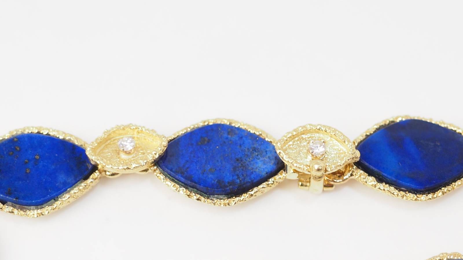 En vous rendant dans notre bijouterie, vous retrouverez, par exemple, ce magnifique bracelet en or jaune sertis de Lapis Lazuli et diamants.
