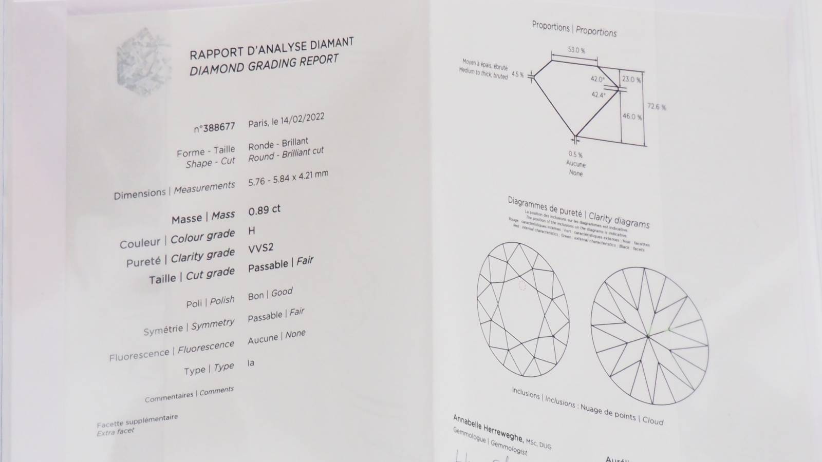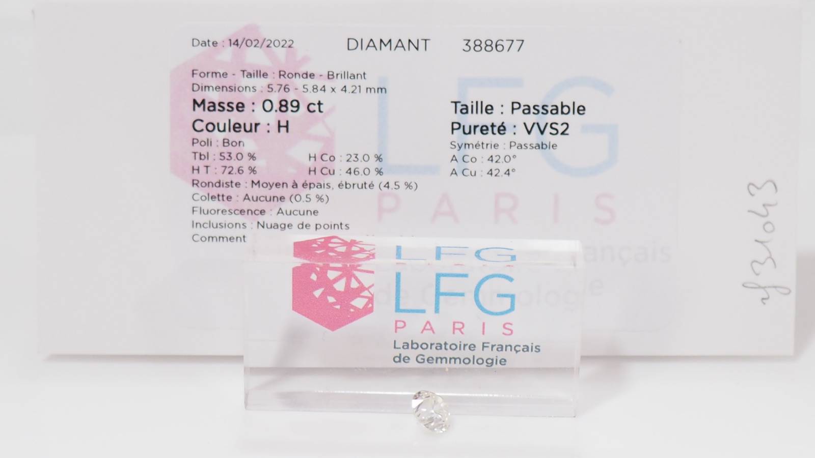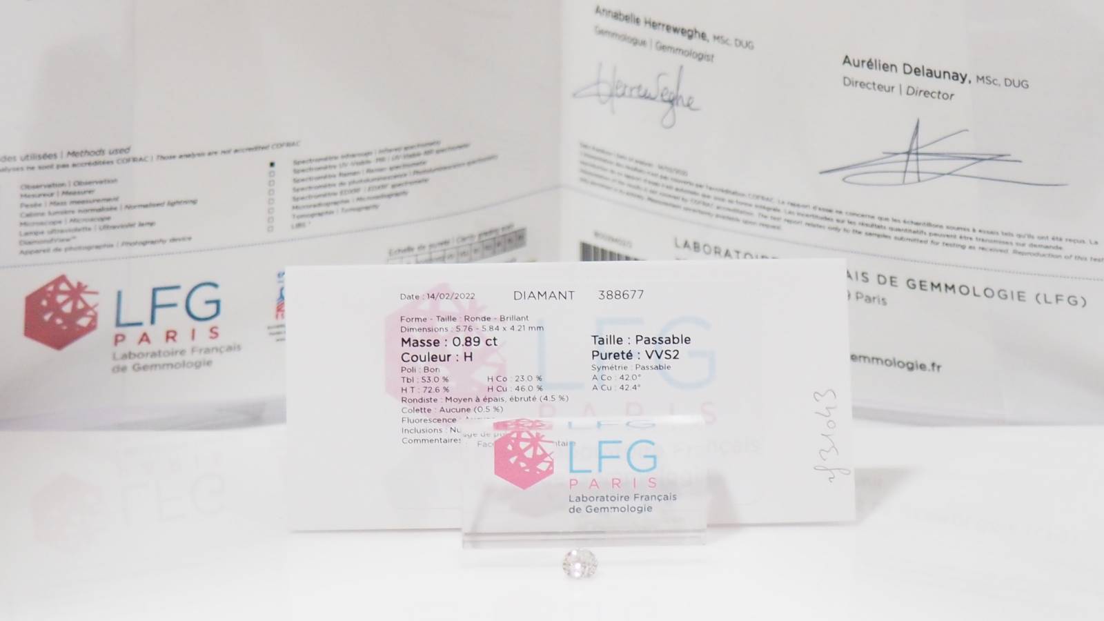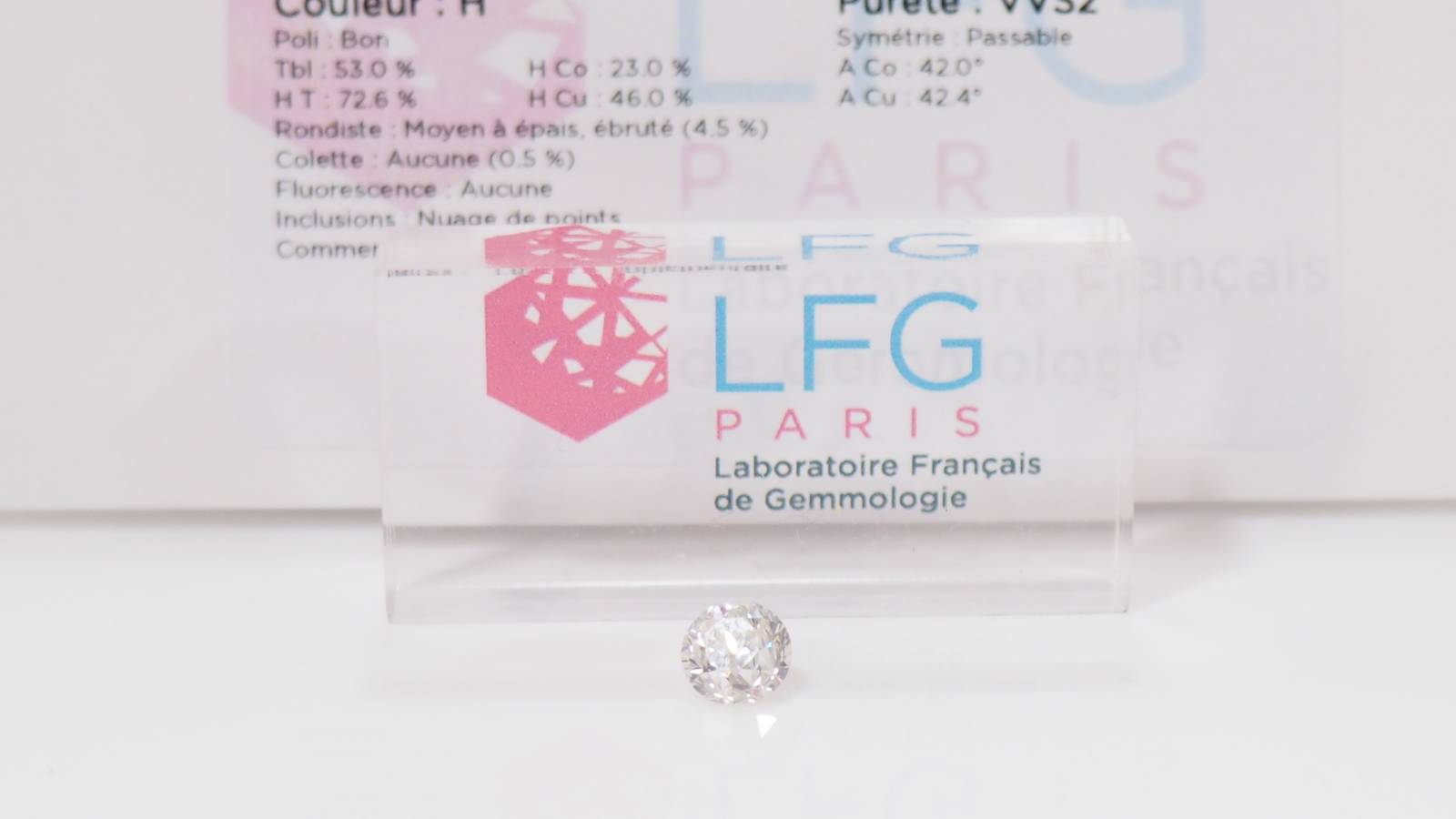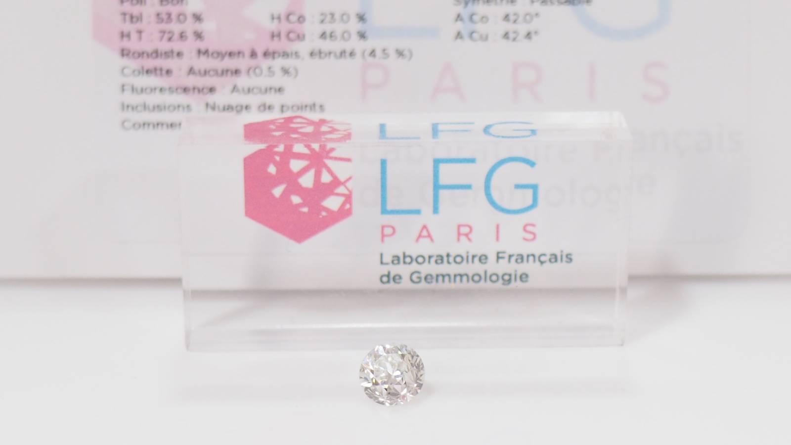Ce diamant est certifié par le Laboratoire Français de Gemmologie : le