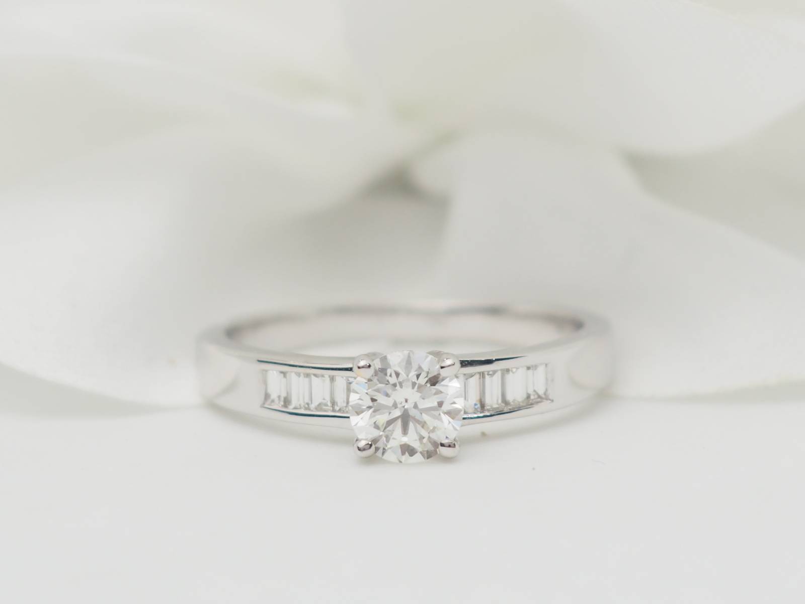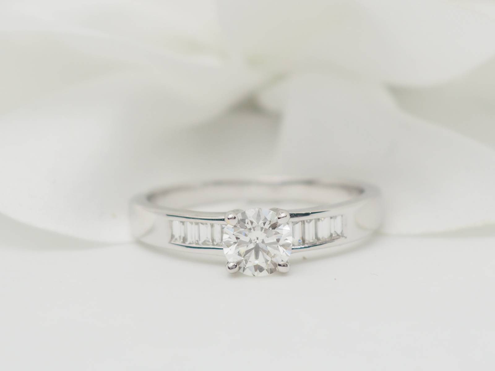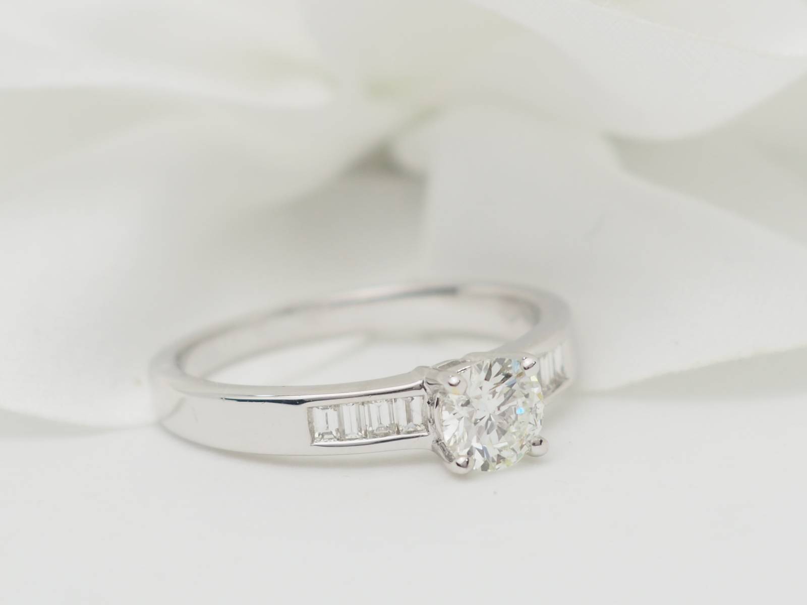 - Solitaire en or blanc, diamant de 0,70 carat et 2 diamants baguettes